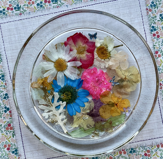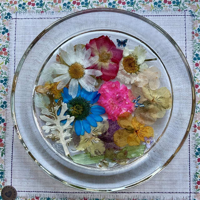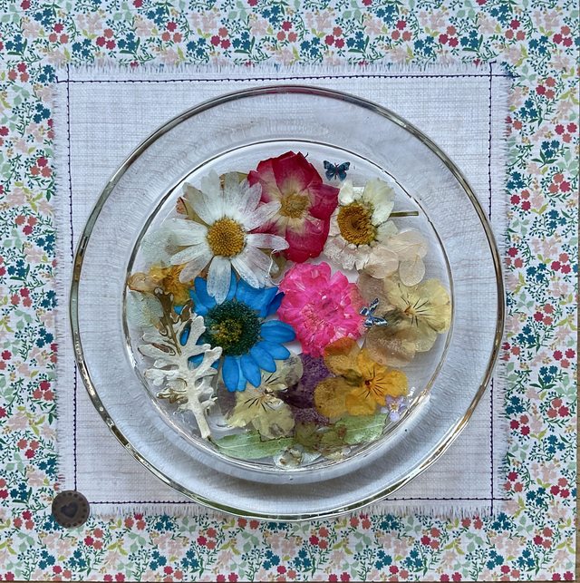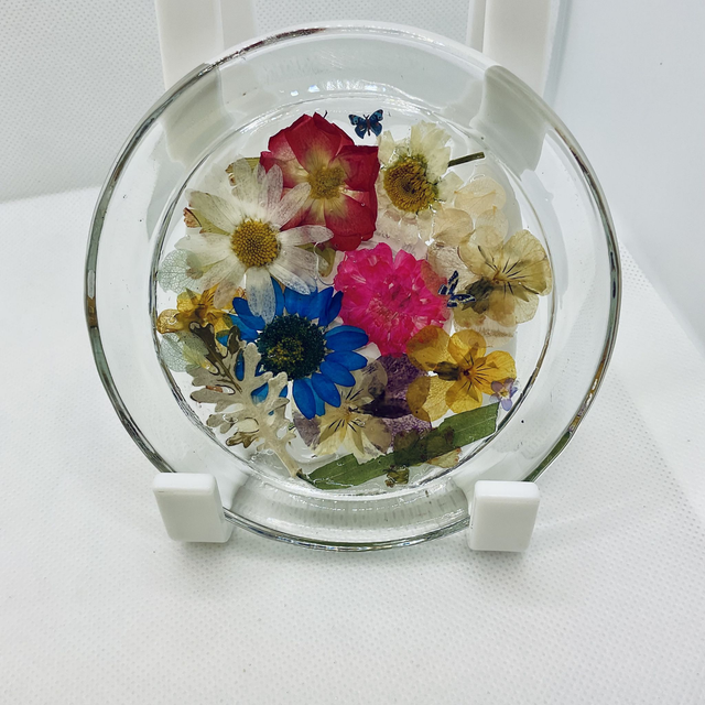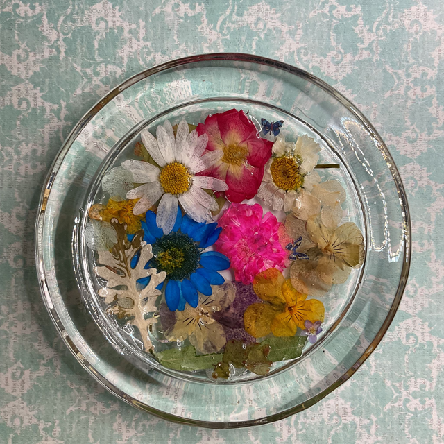 Handmade, elegant round glass ring dish, measuring approximately 10.3 cm in diameter. Crafted with care, it features beautifully preserved dried pressed flowers encased in clear, durable resin, creating a stunning blend of nature and artistry. Perfect for keeping your rings, earrings, and small jewellery organised and easily accessible, this dish adds a touch of delicate charm to any dresser, vanity, or bedside table.