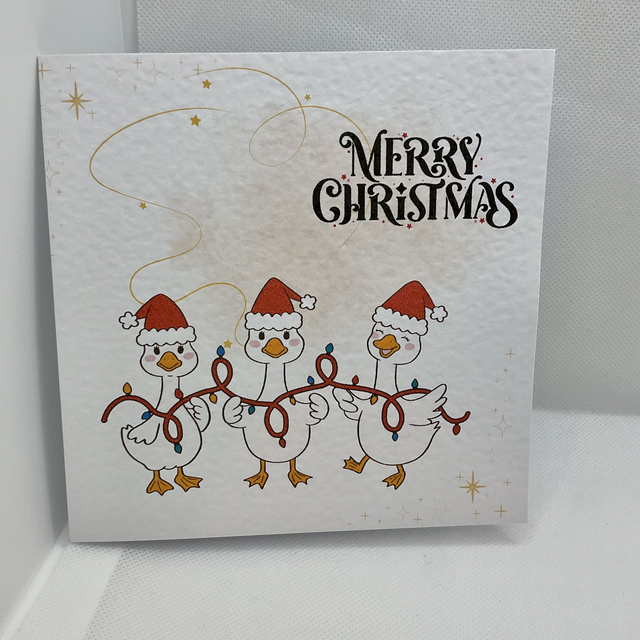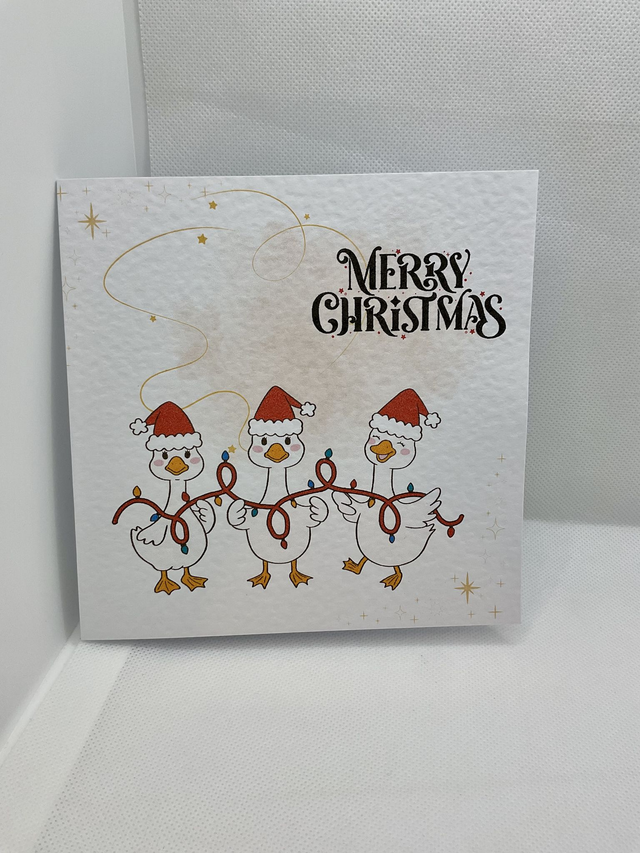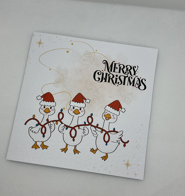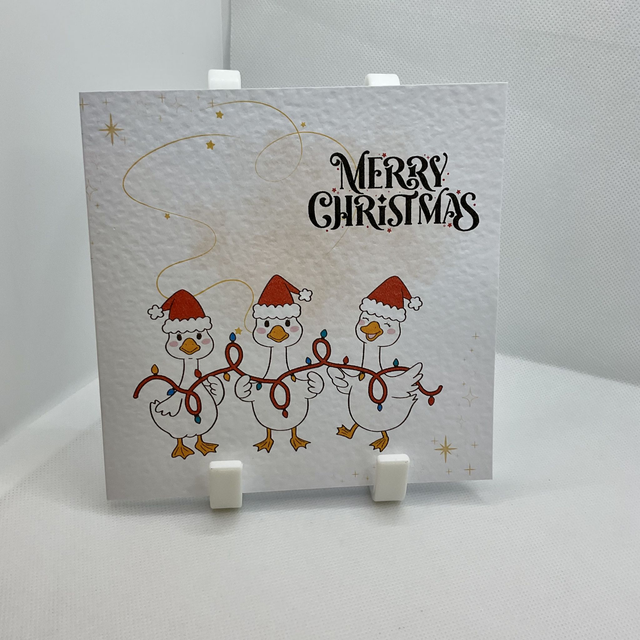 Our funny Christmas ducks greeting card is a must-have for the holiday season! This 6-inch card features quirky ducks in Santa hats, sure to bring a smile to anyone's face. The textured design adds a unique touch, while the cellophane sleeve keeps the card protected. Perfect for sending warm wishes to friends and family, this card comes with an envelope for easy mailing. Spread joy and laughter this Christmas with our adorable duck-themed card!